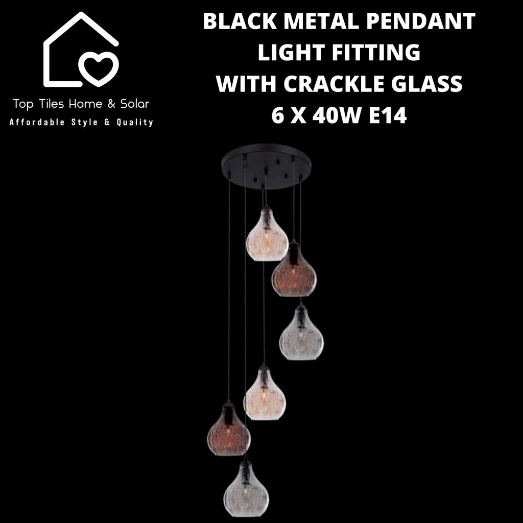 Black Metal Pendant Light Fitting with Crackle Glass - 6 x 40W E14