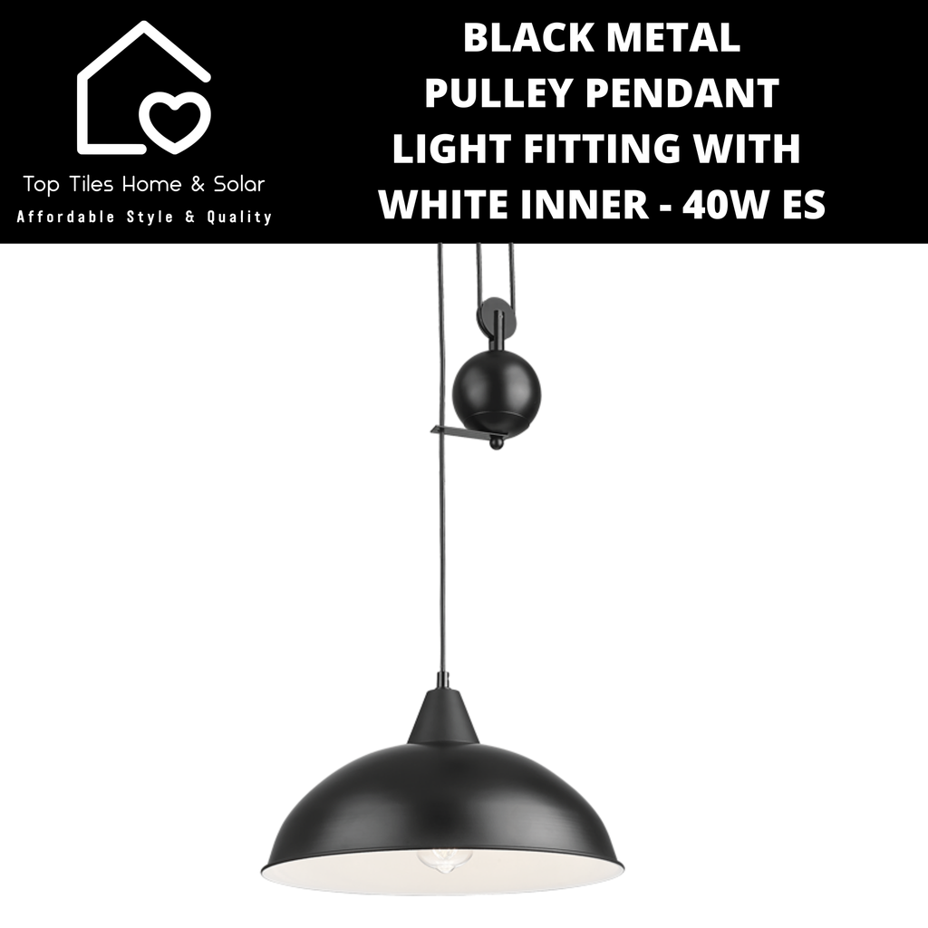 Black Metal Pulley Pendant Light Fitting with White Inner - 40W ES
