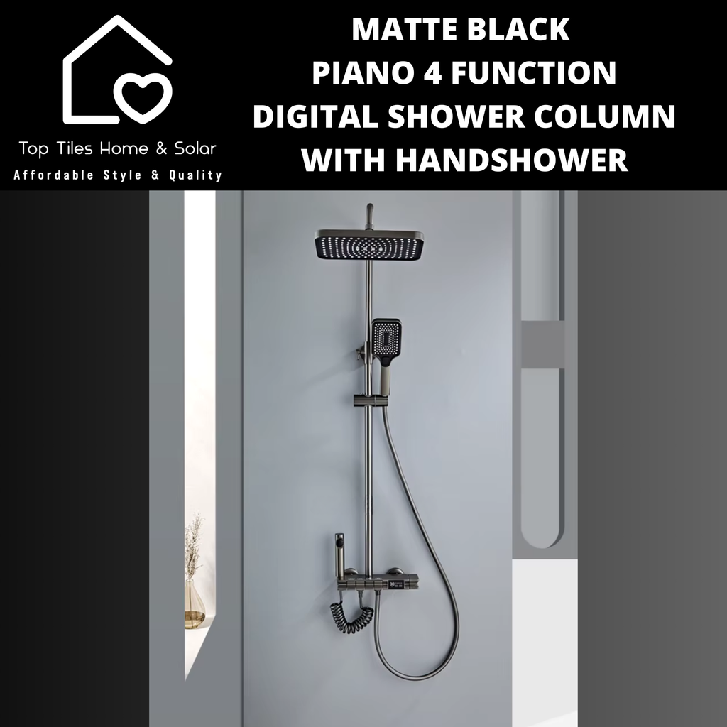 Overall, the Matte Black Piano 4 Function Exposed Digital Shower Column with Handshower is ideal for those seeking a high-quality, technologically advanced solution that seamlessly integrates functionality with modern design elements in their bathroom space.