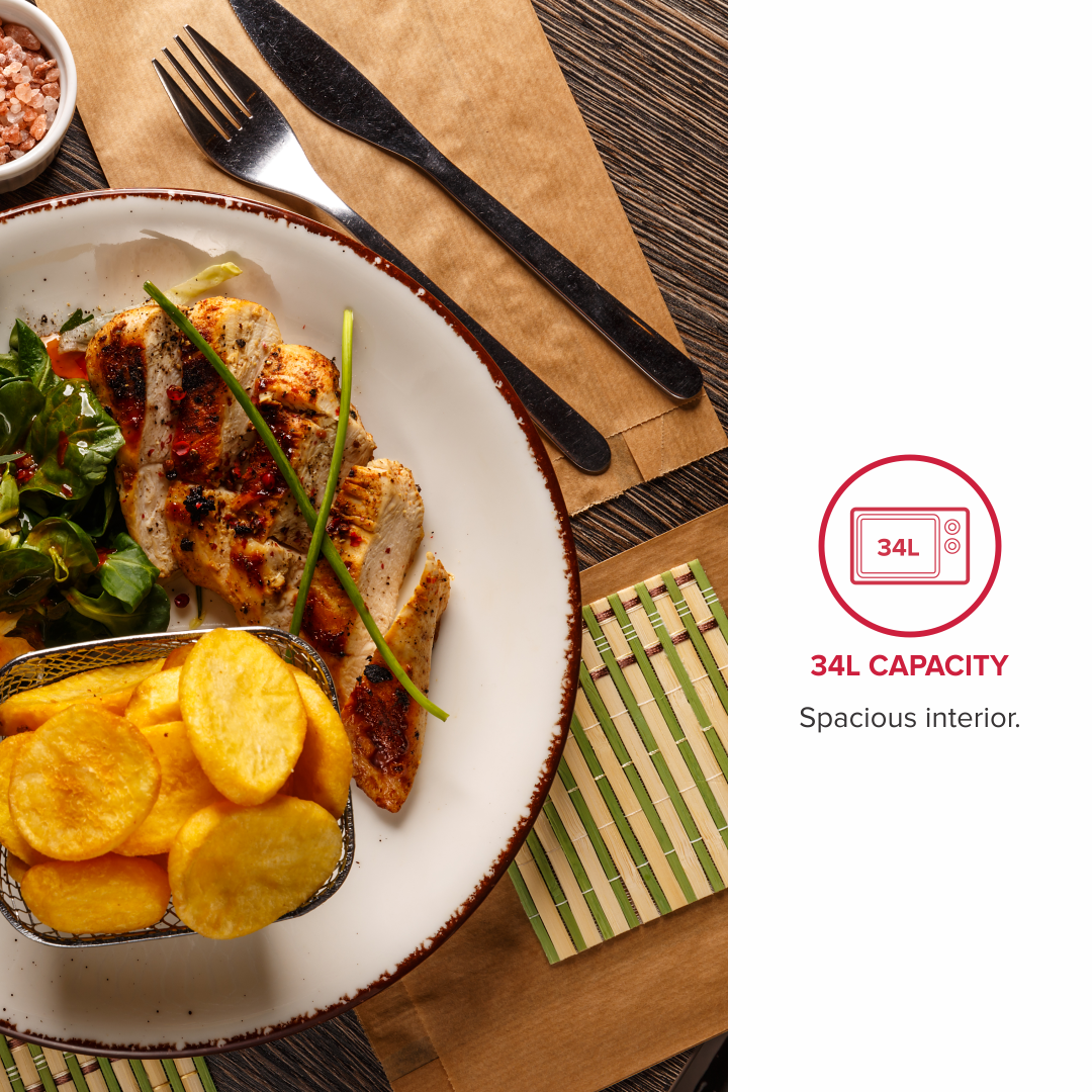 34L Capacity: Spacious interior for larger dishes and family-sized portions.