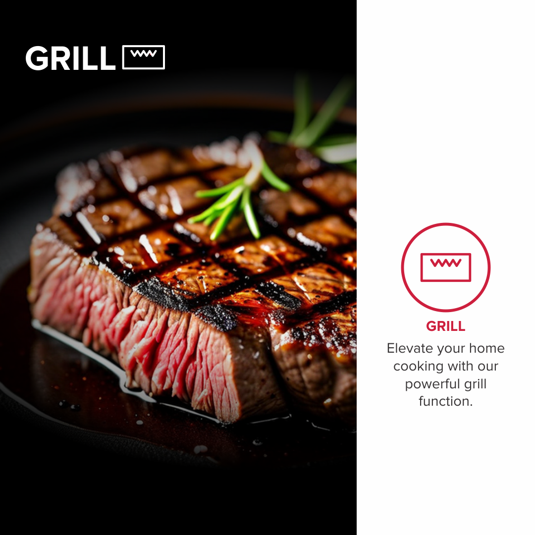 Elevate your home cooking with our powerful grill function. Whether you're grilling steaks, vegetables, or seafood, you can achieve a smoky, charred flavour that's sure to impress.
