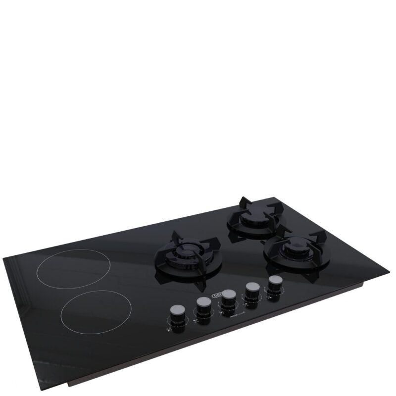 Designed for versatility, it features three powerful gas burners and two electric plates—perfect for any meal. With cast iron pan supports, precise flame control, and a modern black glass finish, this hob adds style and convenience to your kitchen.