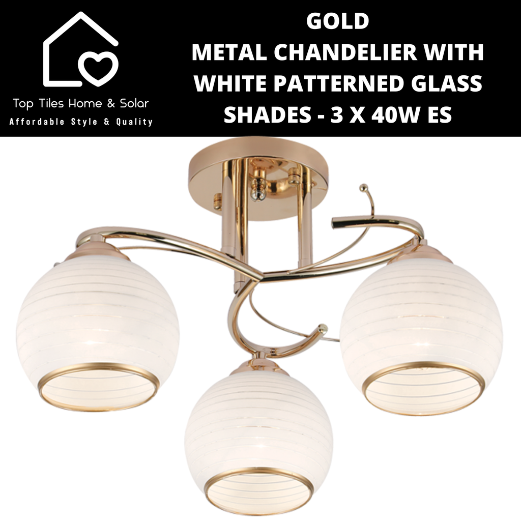 Gold Metal Chandelier with White Patterned Glass Shades - 3 x 40W ES