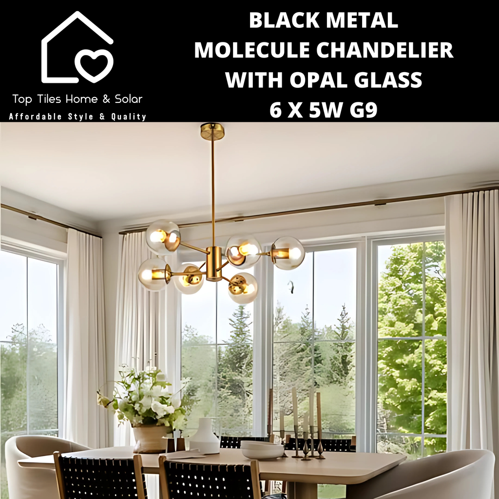 The Gold Metal Molecule Chandelier with Amber Glass offers a sophisticated and contemporary lighting solution.