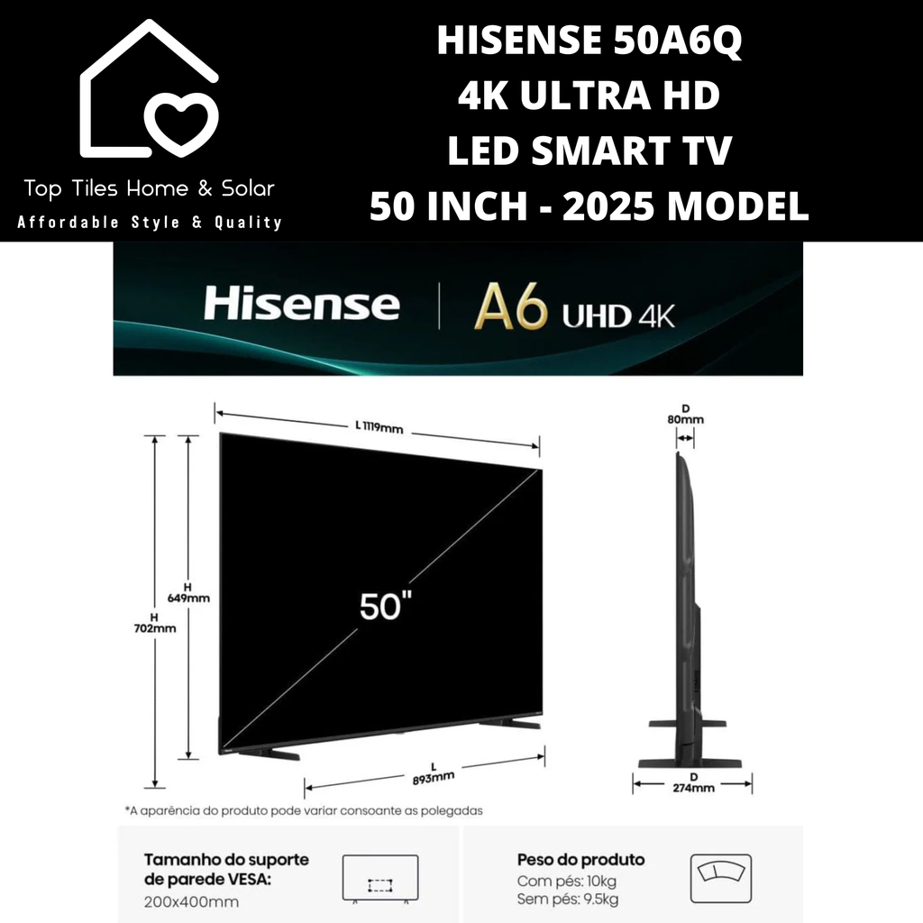 Hisense 50 Inch UHD A6Q Series Smart LED TV – Resolution 3840 x 2160 4K UHD Direct LED VA panel, Refresh Rate 60Hz native, Contrast Ratio 4000:1, Brightness 300 nits typical, Viewing Angle 178° horizontal/vertical, Color Depth 8bit + FRC, HDR Support HDR10 / HDR10+ decoding / HLG / Dolby Vision, Audio Output 20W (2 x 10W) Dolby Audio and DTS Virtual X, Connectivity 3 x HDMI 2.0 (ALLM, VRR 48-60Hz, 1 with eARC), 2 x USB 2.0, Ethernet LAN, Wi-Fi 2.4G/5G, Bluetooth 5.0, Tuners DVB-T2/T/C/S2/S with 2 RF inputs, Audio Inputs 1 L/R analog, headphone jack, optical SPDIF, Operating System VIDAA Smart OS, Dimensions approx. 1119 x 649 x 80 mm, Weight approx. 9.5 kg, Warranty 48 Months.