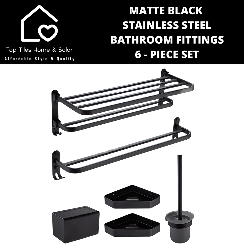 The Matte Black Stainless Steel Bathroom Fittings 6 Piece Set offers a stylish and durable solution for organizing and enhancing your bathroom space.