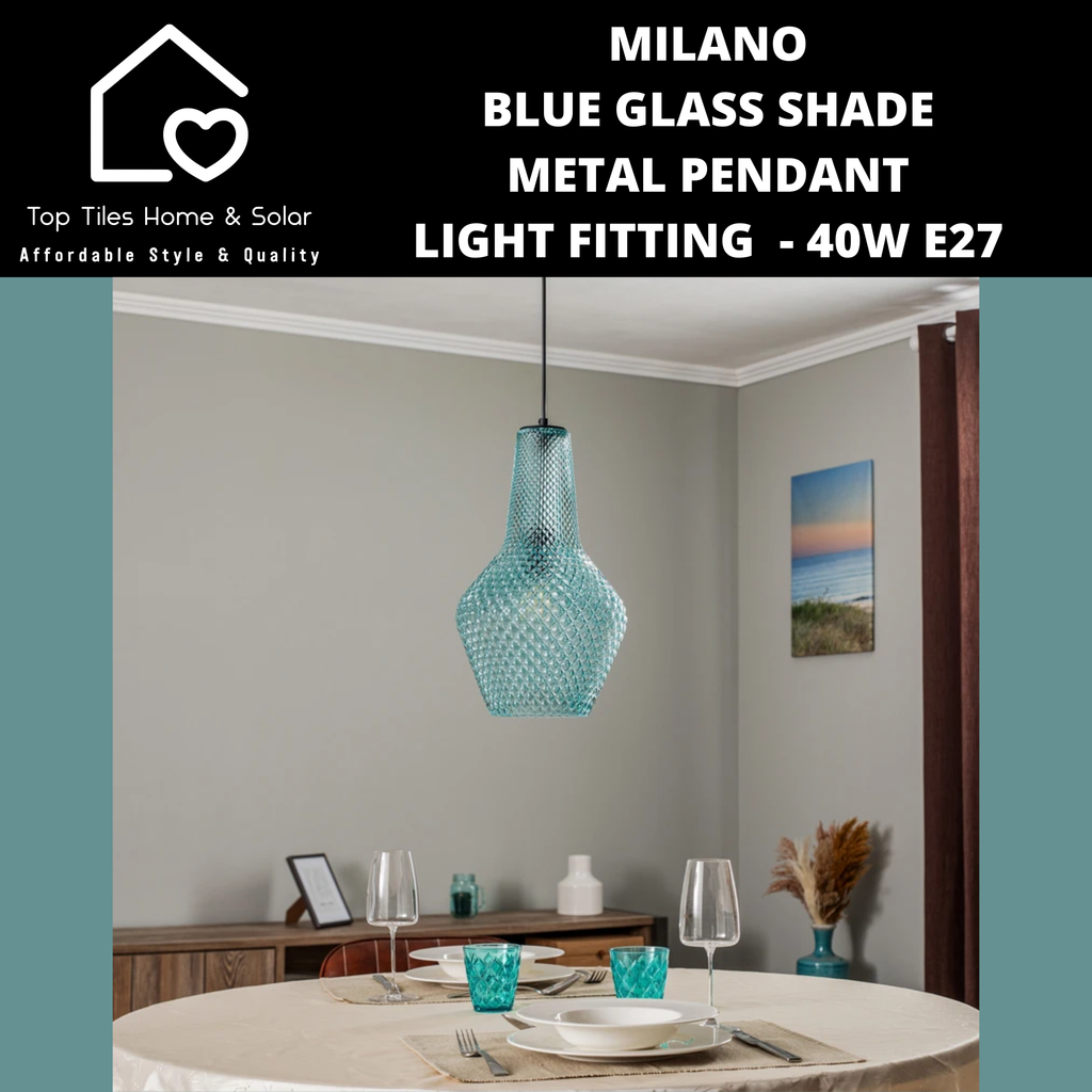 The Milano Blue Glass Shade Metal Pendant Light Fitting offers a sophisticated and stylish lighting solution for a variety of interior spaces.
