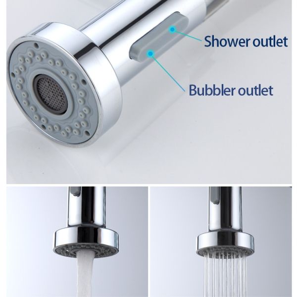 The pull out kitchen faucet with 2 function sprayer, which can switch the water outlet mode with one button, effectively saving water.