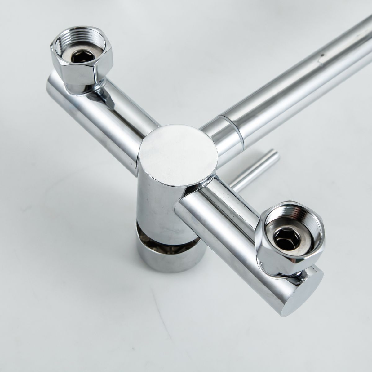 The Polished Chrome Wall Mount Sink Mixer with Swivel Spout & Directional Spray is a modern and functional fixture designed to enhance both the aesthetics and usability of kitchen or bathroom sinks.