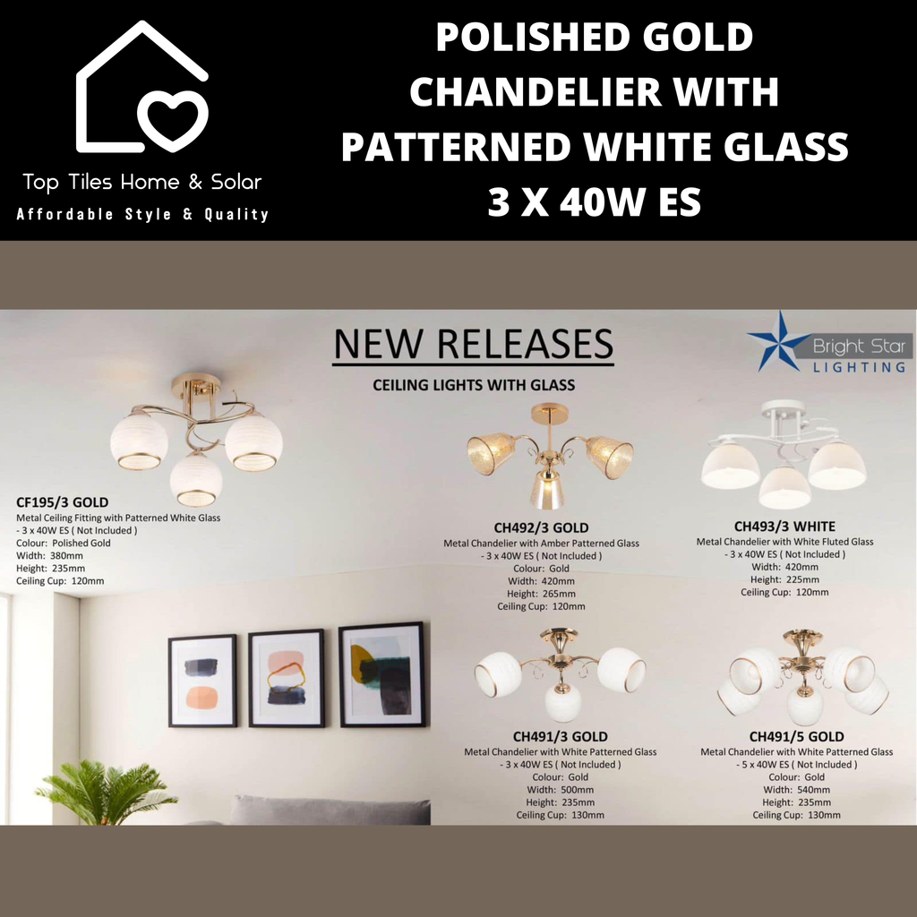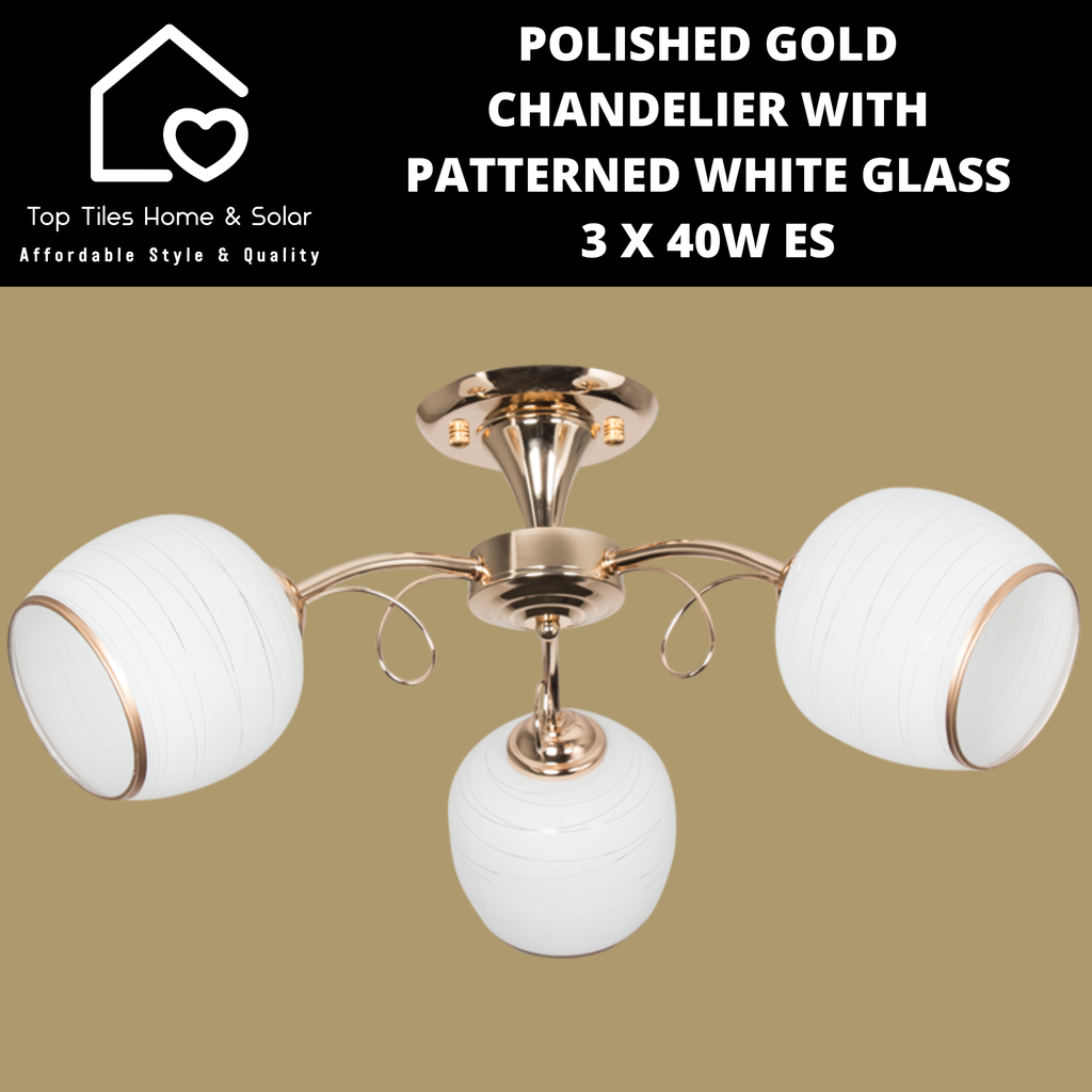 Polished Gold Chandelier with Patterned White Glass - 3 x 40W ES