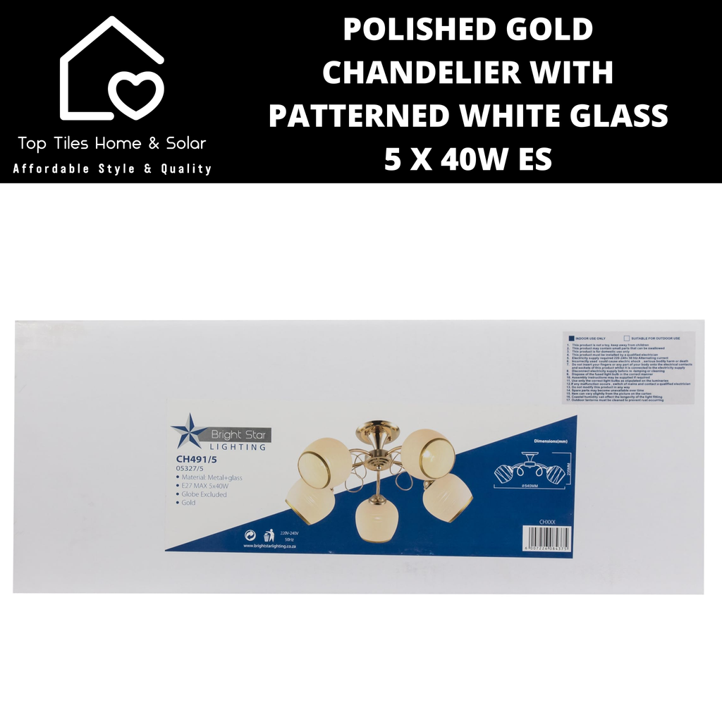 Polished Gold Chandelier with Patterned White Glass - 5 x 40W ES