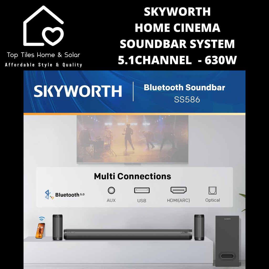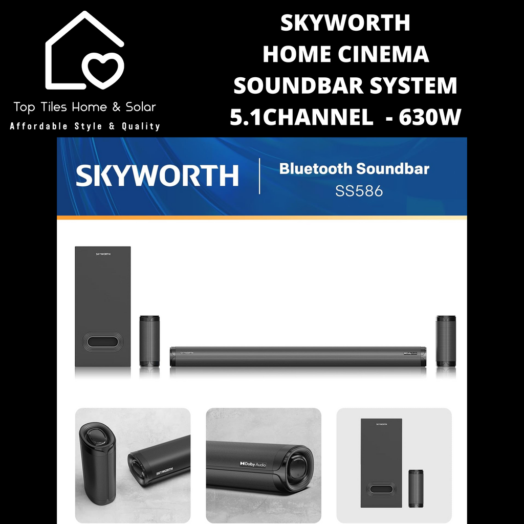 The Skyworth 5.1CH Home Cinema Soundbar System delivers immersive 5.1-channel surround sound with Dolby Digital Plus and Dolby Digital support, producing powerful audio with a max output of 630W. It features Bluetooth 5.0 connectivity with a 10-meter range, USB playback, selectable EQ modes, and wireless surround speakers for a clutter-free setup. Compatible with TVs, Android phones, and iPhones, this system enhances your home entertainment with versatile inputs and a sleek design, backed by a 1-year limited warranty